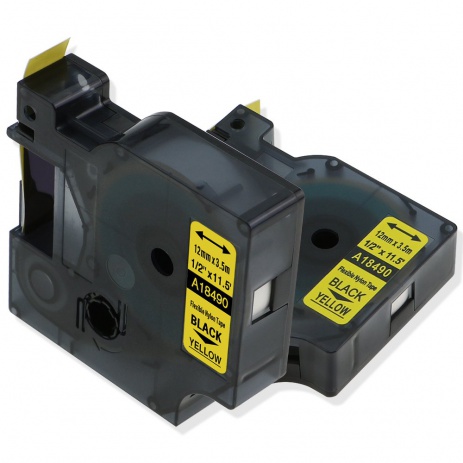 Kompatibilní páska s Dymo 18490, Rhino 12mm x 3,5m černý tisk / žlutý podklad, nylon flexi. Podélné naříznutí podkladu umožňuje pohodlné oddělení štítku. Pásky jsou odolné proti vodě. Kompatibilní pásky můžete použít téměř na všechny povrchy. Jednoduchá aplikace na plastové, dřevěné, papírové, kovové či skleněné materiály..